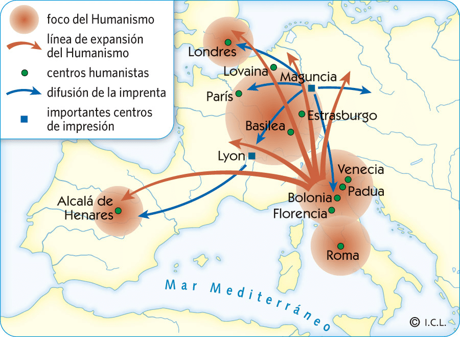 Clave para entender la expansión del Humanismo por el resto de Europa desde Italia fue la invención de la imprenta, por el alemán Gutemberg en 1455, en la ciudad de Maguncia, combinando la tipografía (uso de planchas con tipos o letras móviles entintadas) y el papel. Esto supuso el aumento del número de libros y un gran descenso de su precio, lo que ayudó a la expansión de la cultura y el conocimiento en general.