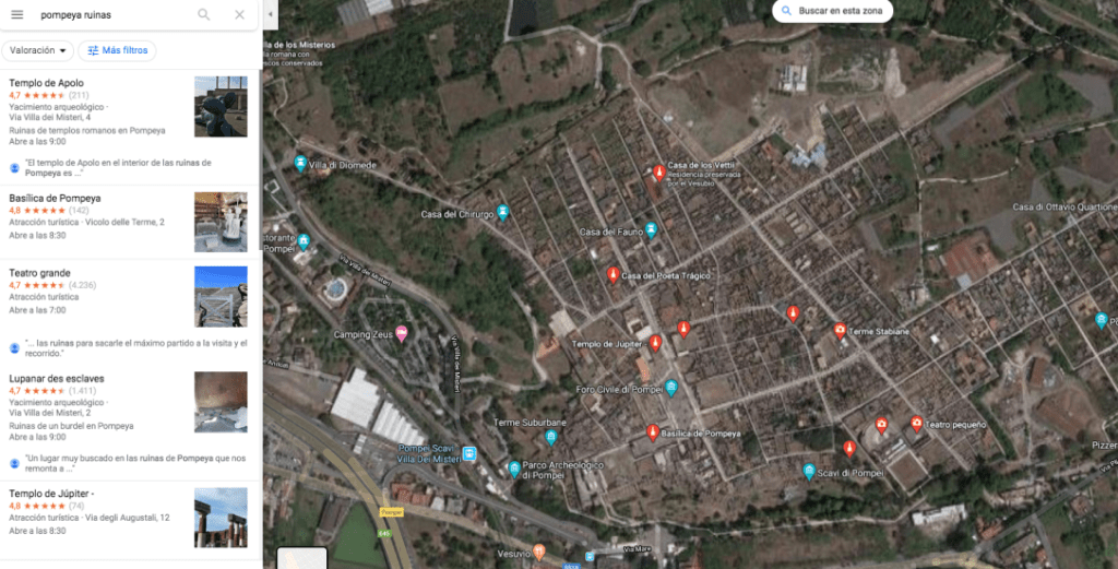 Como has podido ver, Pompeya quedó sepultada por las cenizas de la erupción del volcán Vesubio. Vamos a visitar la ciudad en la actualidad. Entra en google maps, indica las «Ruinas de Pompeya» y entra a visitarlas con el Street View.