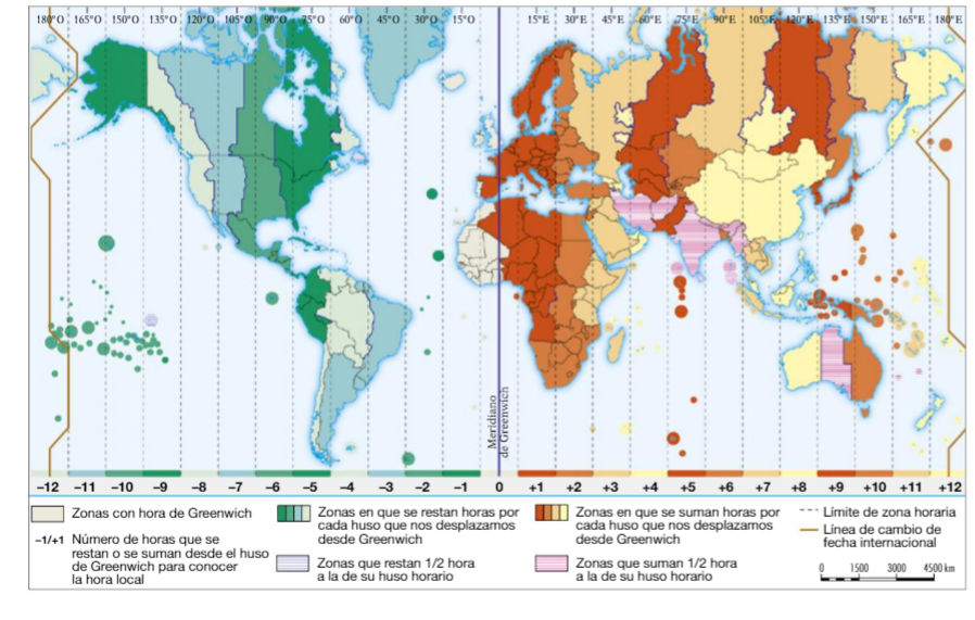 - existencia de diferentes horas: los husos horarios son cada uno de los 24 sectores esféricos en que se divide la superficie de la Tierra. Resultan de repartir los 360º de la esfera terrestre entre las 24 horas que invierte en dar una vuelta completa sobre su propio eje.