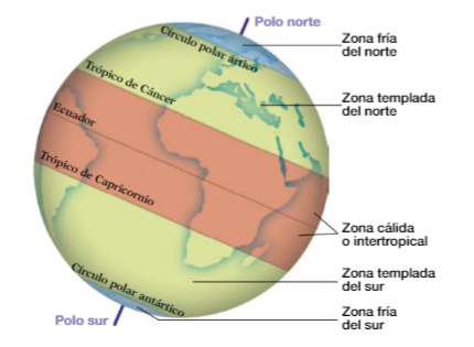- zonas frías: los rayos solares caen muy inclinados, de ahí las temperaturas frías.