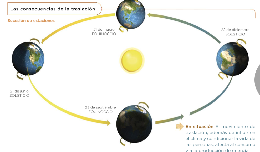 El desplazamiento de la Tierra alrededor del Sol se denomina movimiento de traslación. El planeta describe una órbita elíptica a lo largo de 365 días y 6 horas. Este movimiento de traslación tiene una importante consecuencia: la sucesión de las estaciones.