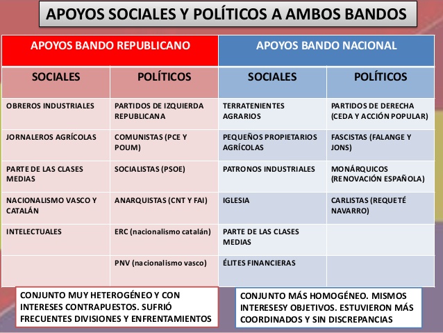 • Sublevado (autodenominados «Nacionales»): Quienes pretendían abolir el régimen republicano y restaurar una monarquía tradicional y conservadora. Estaba liderado por los militares golpistas, principalmente el General Franco, y era respaldado por los sectores más conservadores de la población: parte del Ejército, la Iglesia, los grandes empresarios y terratenientes, los partidos de derechas, monárquicos, falangistas…