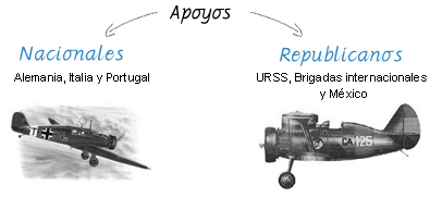 La República recibió apoyo militar de la Unión Soviética (armamento, aviones y asesoramiento militar), de las Brigadas Internacionales (voluntarios antifascistas alistados de otros países de Europa y Norteamérica), y ayuda alimentaria y sanitaria de México. Mientras que el bando sublevado recibió ayuda militar de la Alemania nazi y la Italia fascista (enviaron tropas militares y flotas de aviones), así como apoyo logístico (petróleo y suministros) y voluntarios anti-comunistas de Portugal.