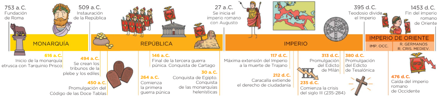 Durante la monarquía, Roma se configuró como una ciudad-estado, hasta convertirse en la urbe más importante de su región, el Lacio. El último de los reyes fue Lucio Tarquino el Soberbio, que ejerció el poder de forma muy autoritaria. Por ello, en el año 509 a. C., los romanos lo expulsaron y proclamaron la República, que duró hasta el año 27 a. C.