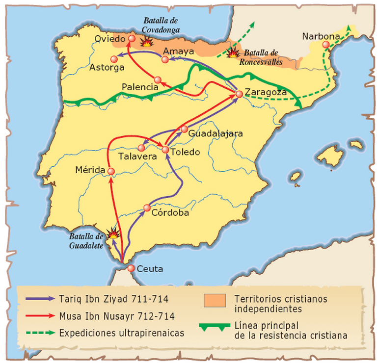 En cerca de tres años, sometieron casi toda la península, excepto las zonas montañosas del noroeste. En el año 722, los musulmanes fueron derrotados en la batalla de Covadonga por los astures, los habitantes de la zona, dirigidos por el caudillo visigodo Pelayo. Los musulmanes intentaron entonces adentrarse en Europa: cruzaron los Pirineos y saquearon el reino franco. Tras ser derrotados en la batalla de Poitiers (732) por el ejército franco dirigido por Carlos Martel, se vieron obligados a regresar a la península ibérica