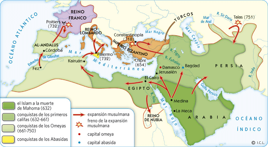expandieron el Islam a través de la yihad o guerra santa. Durante este califato, el Islam controló toda la península Arábiga, Persia y Egipto, y surgieron los primeros enfrentamientos con el imperio Bizantino. La capital del estado está en Medina. A la muerte de Alí, el yerno de Mahoma y su último descendiente, la familia Omeya subió al poder. - El califato Omeya (661-750): Trasladaron la capital del Imperio a Damasco y organizaron el territorio en emiratos o provincias. En esta etapa se produjo la máxima expansión del Imperio islámico: los ejércitos musulmanes conquistaron extensos territorios desde Persia hasta la península Ibérica. El avance por Europa fue frenado por los francos en el año 732. Una rebelión palaciega acabó con todos los Omeya muertos, excepto el príncipe Abderramán, y subió al poder a Abul Abbas y sus sucesores.