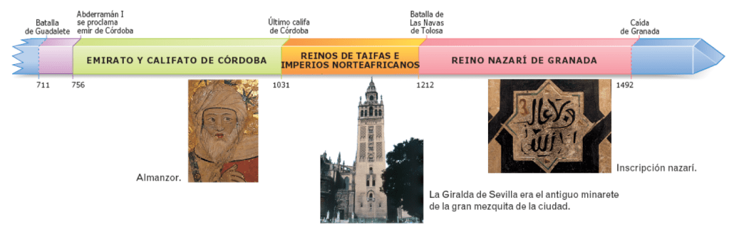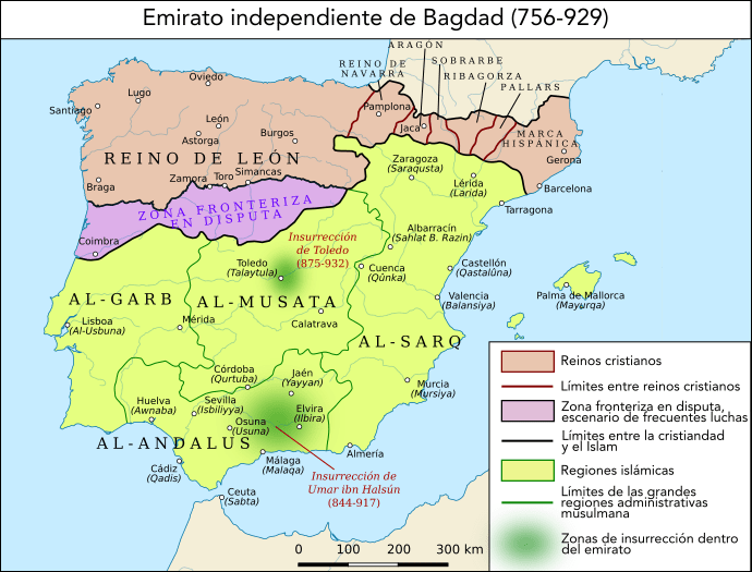 familia, ocupó el territorio andalusí y en el 756 se proclamó emir independiente políticamente de los nuevos califas, aunque respetaba su autoridad religiosa. Esta larga etapa se vio salpicada de conflictos contra los reinos cristianos del norte y las revueltas internas cuando los emires eran más débiles. Abderramán I consiguió pacificar el territorio y asegurar las fronteras.