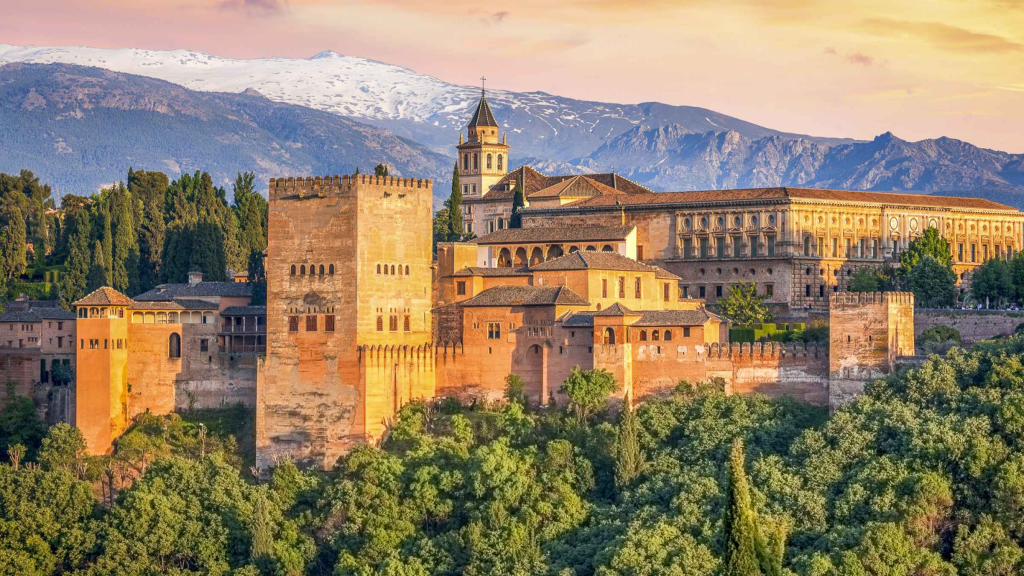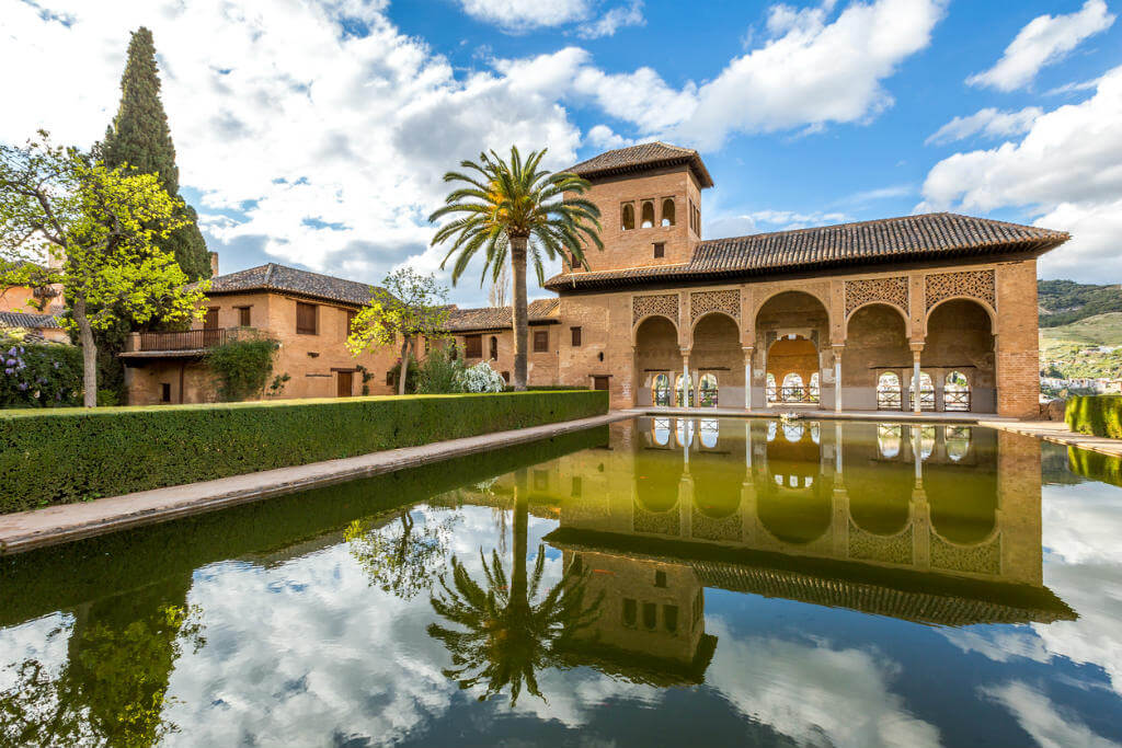 En el Reino nazarí de Granada, durante los siglos XIII y XIV , se levantaron numerosas construcciones palaciegas y defensivas en el recinto de la Alhambra. Se utilizaron materiales como el ladrillo, el yeso y la cerámica, y los muros y arcos se decoraron con formas caligráficas, atauriques y lacería mocárabes . En el exterior del recinto se dispusieron amplios jardines y patios con estanques y fuentes.