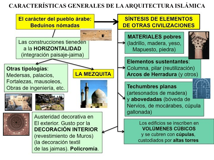El arte andalusí incorporó a las características del arte musulmán elementos propios, como los arcos de herradura y de medio punto decorados con dovelas de dos colores, blanco y rojo, y algunas particularidades propias de la arquitectura visigoda, como los capiteles y las columnas.