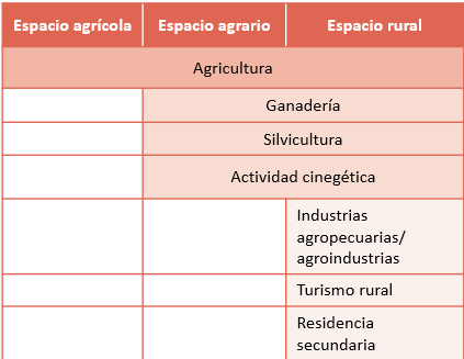 - Espacio rural, incluye todo el espacio «no urbano». Comprende, el espacio agrario y aquellas tierras donde se instalan otras actividades propias de la ciudad, como zonas de ocio, centros comerciales, urbanizaciones, fábricas, residencias secundarias, etc.