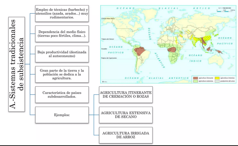 Recuerda, La agricultura de subsistencia se practica en países con escaso desarrollo técnico y se destina al autoconsumo. Se caracteriza por su escasa productividad. Emplea mucha mano de obra