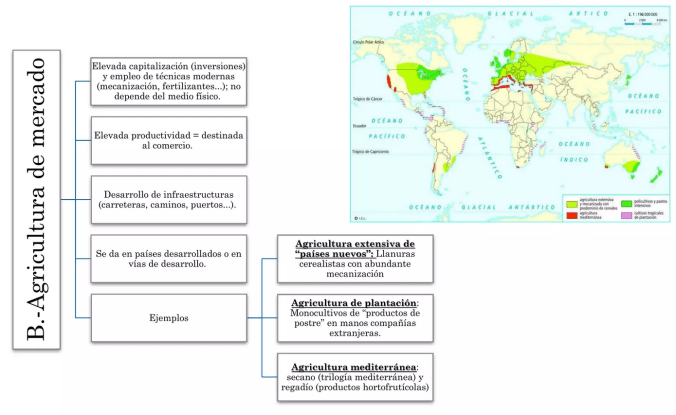 Recuerda, La agricultura de mercado se practica en los países desarrollados. Utiliza técnicas muy avanzadas, requiere enormes inversiones de capital y tiene una alta productividad. Necesita escasa mano de obra