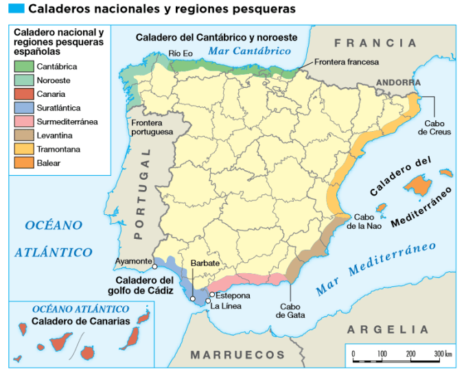 Las regiones pesqueras principales son Galicia, por sus capturas y el valor de la pesca, seguida de las regiones cantábrica, sur atlántica andaluza, canaria y, a gran distancia, de las mediterráneas.