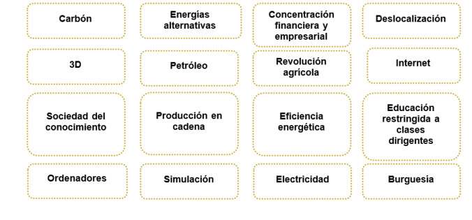 Usa colores para agrupar los siguientes términos en función de a qué período de la actividad industrial corresponden: Primera Revolución industrial, Segunda Revolución industrial o Tercera Revolución industrial