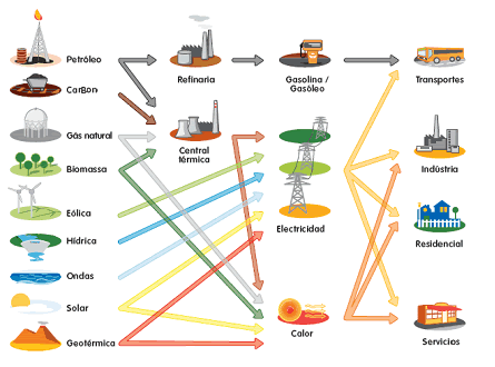 Las fuentes de donde obtenemos la energía combinan energías renovables, eólica, hidroeléctrica, solar y biomasa, con energías no renovables, destacando gas natural y nuclear para producción eléctrica y derivados del petróleo para el transporte.