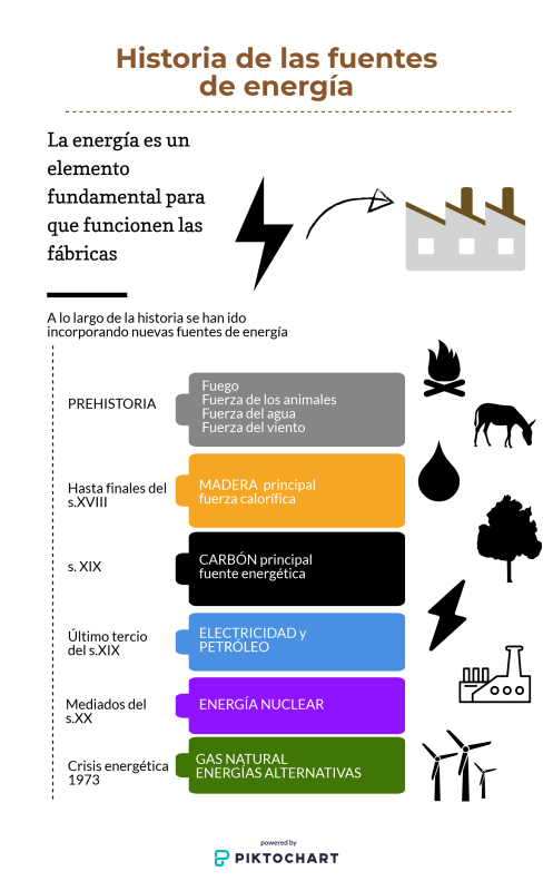 • Fuentes de energía. Son los recursos naturales que proporcionan la fuerza necesaria para llevar a cabo el proceso de transformación industrial de las materias primas.