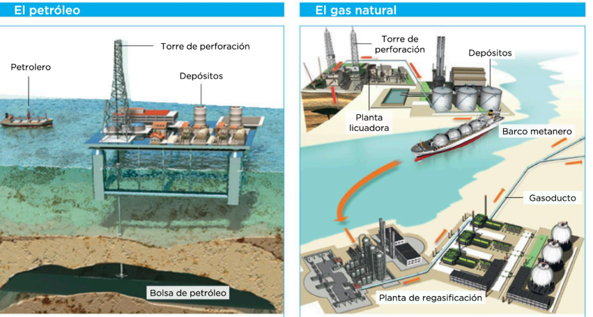 Se utilizan para producir energía, y en el caso del petróleo además, para fabricar plásticos y productos químicos. Suelen encontrase juntos y proceden de la descomposición de animales y vegetales. Requieren un costoso transporte a través de oleoductos y gasoductos