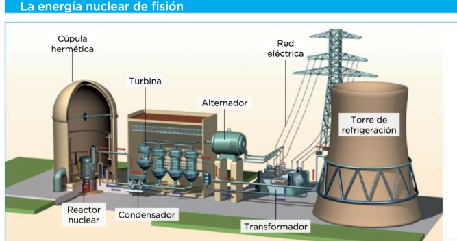 En las centrales nucleares se rompen átomos de minerales radioactivos, como el uranio, lo que genera muchísimo calor que calienta agua, la convierte en vapor y hace girar una turbina. Los peligros de la energía nuclear son los riesgos de fuga radioactiva y el tratamiento de todos los materiales empleados que son altamente contaminantes. Los principales productores son EE.UU y Francia.