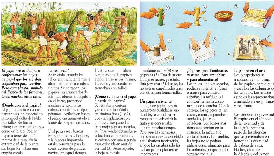 Los egipcios usaron la escritura jeroglífica que era de tipo ideográfico, es decir, cada signo o dibujo, representaba una idea. Después la escritura silábica, en la que el dibujo representaba un sonido. Escribían en rollos de papiro, que se hacia entrelazando tallos prensados y secados. También escribían en las paredes de las construcciones. Para ir más rápido, los escribas simplificaron los signos y apareció la escritura hierática y la demótica. La biblioteca más grande y famosa estuvo en la ciudad de Alejandría, donde hacían copias de todos los libros que encontraban. La escritura fue descifrada en 1822 por el francés Champollion, gracias a la piedra Rosetta, que tenía el mismo texto en varios idiomas.